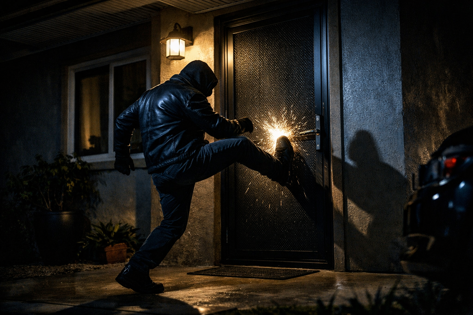 Most break-ins start the same way. The intruder goes for the fastest entry point. That usually means doors or windows, especially a front entry, side access point, or large sliding or hinged opening at the back. The first contact is rarely subtle. It is usually a hard shove, a kick, a shoulder charge, or a tool used to strike the security screen and frame.